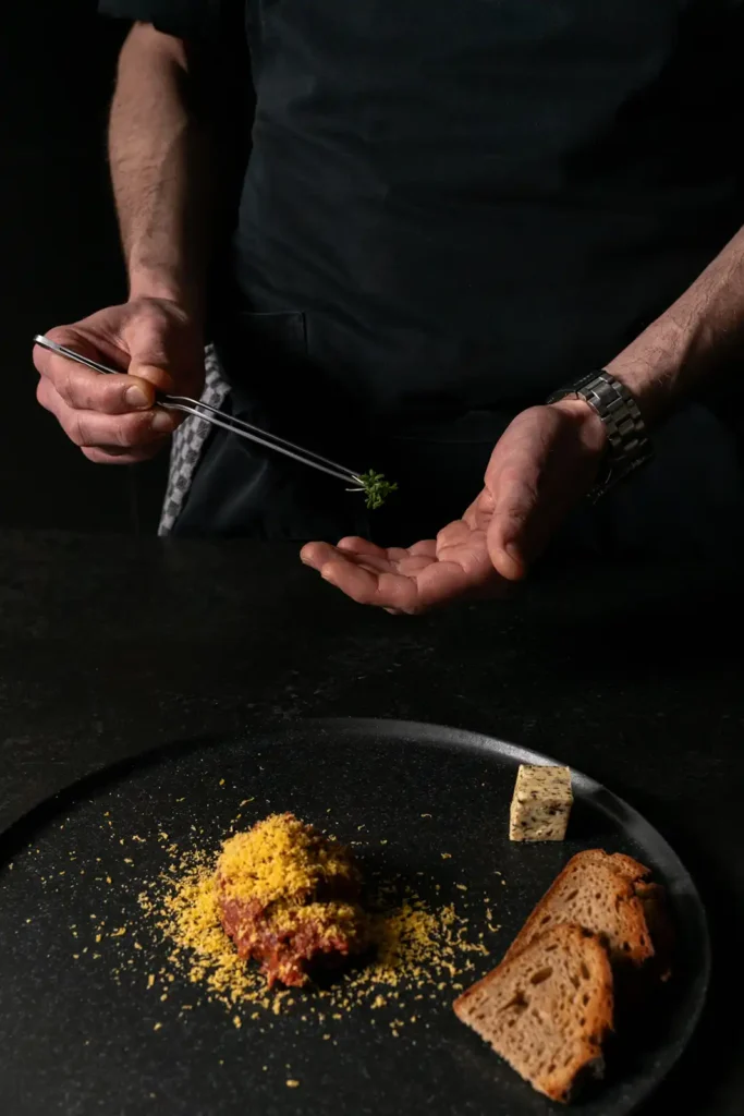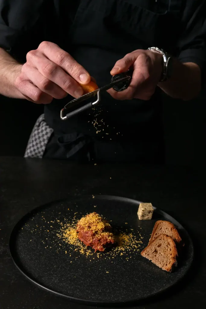Trüffel Butter. getrocknetes Eigelb. Gartenkresse.